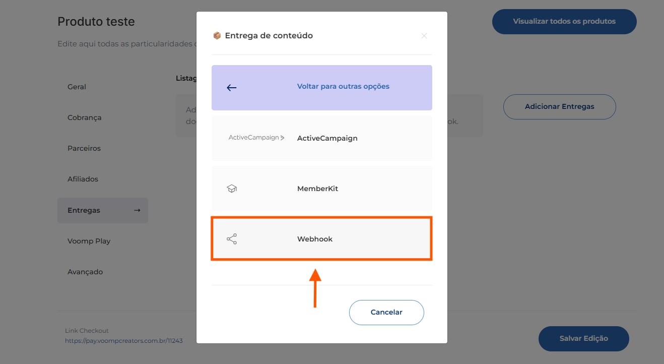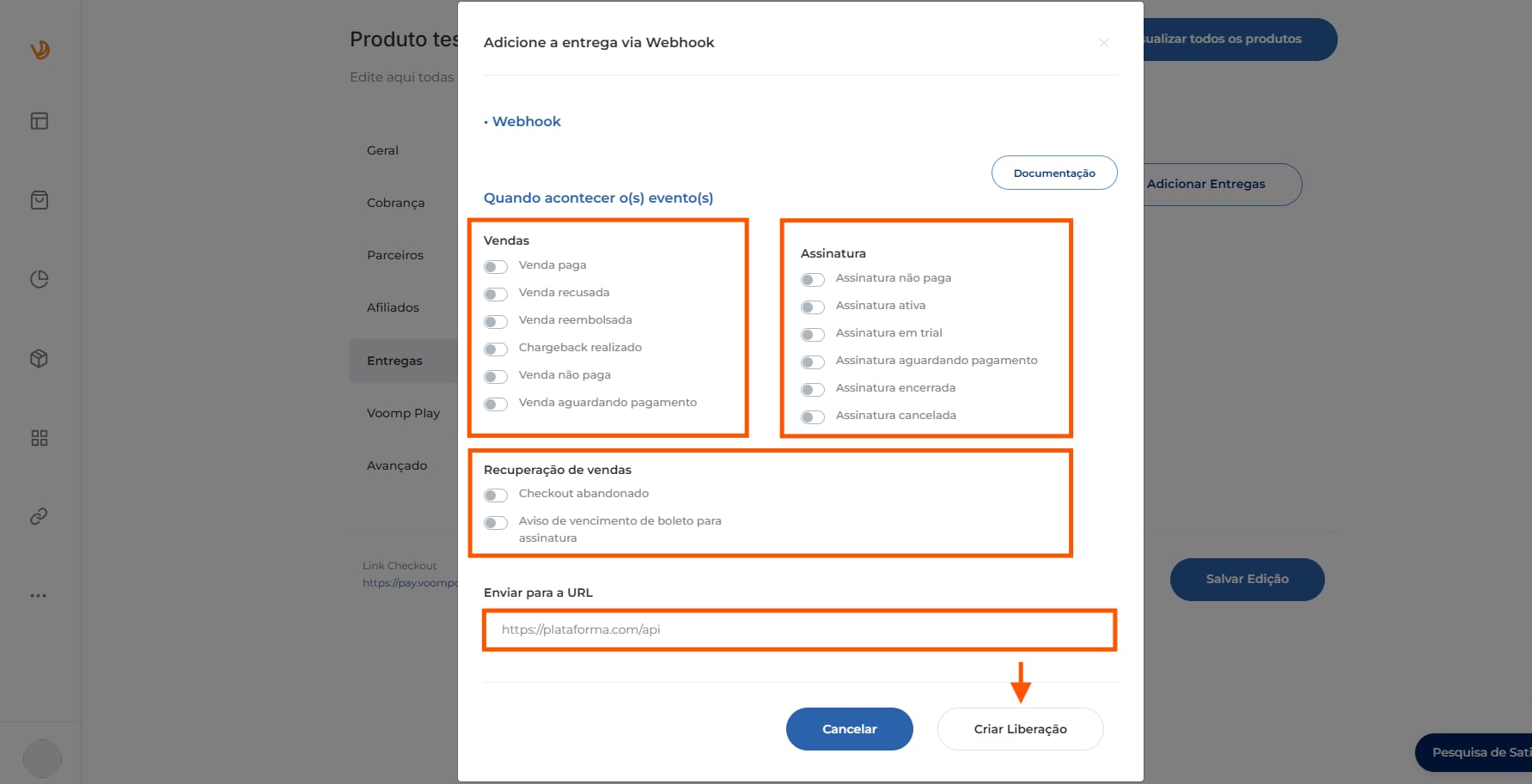 - Enviar para a URL: insira a URL do Webhook que receberá os eventos disparados pela Voomp.