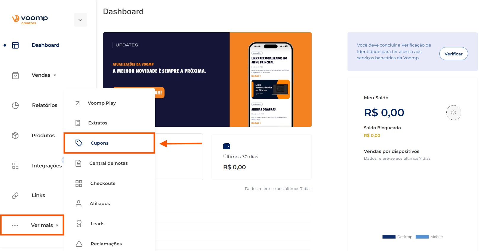 Na página inicial, acesse “Ver mais” > “Cupons”:”