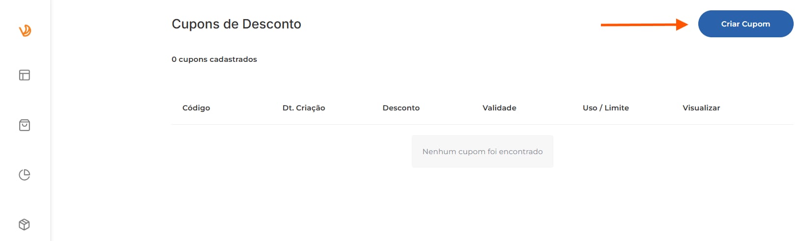 Clique em “Criar Cupom” no canto superior direito da tela: