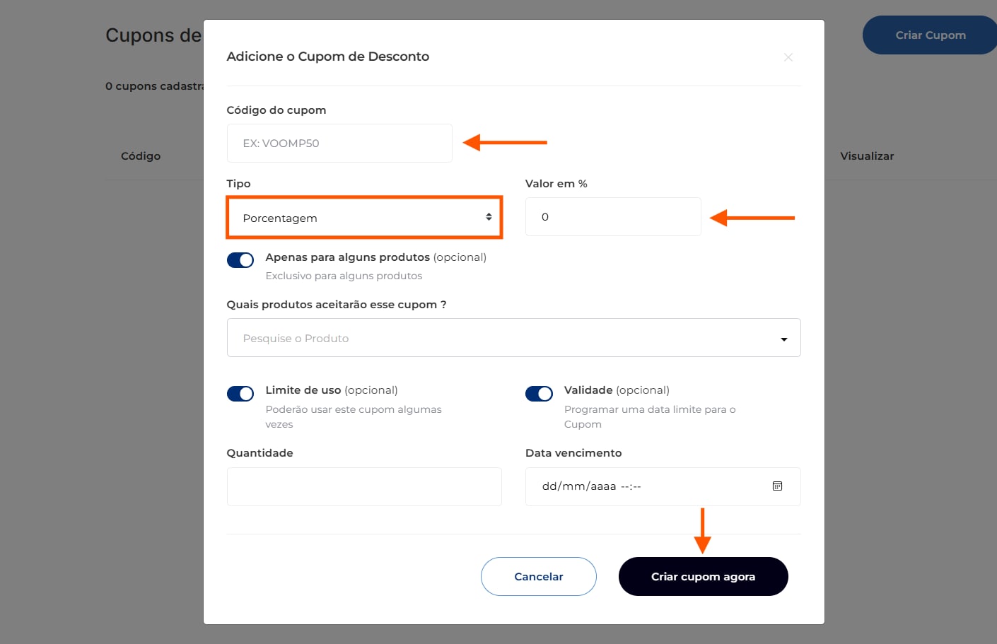 Com o modal de configuração aberto, cadastre os campos obrigatórios “Código do cupom”, “Tipo” para escolher se a aplicação do desconto será em % ou R$ e “Valor em” para digitar o valor.