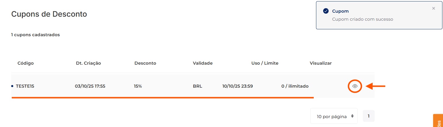 Pronto, o cupom de desconto foi criado e você pode visualizar suas informações de forma detalhada acessando o botão de visualização: