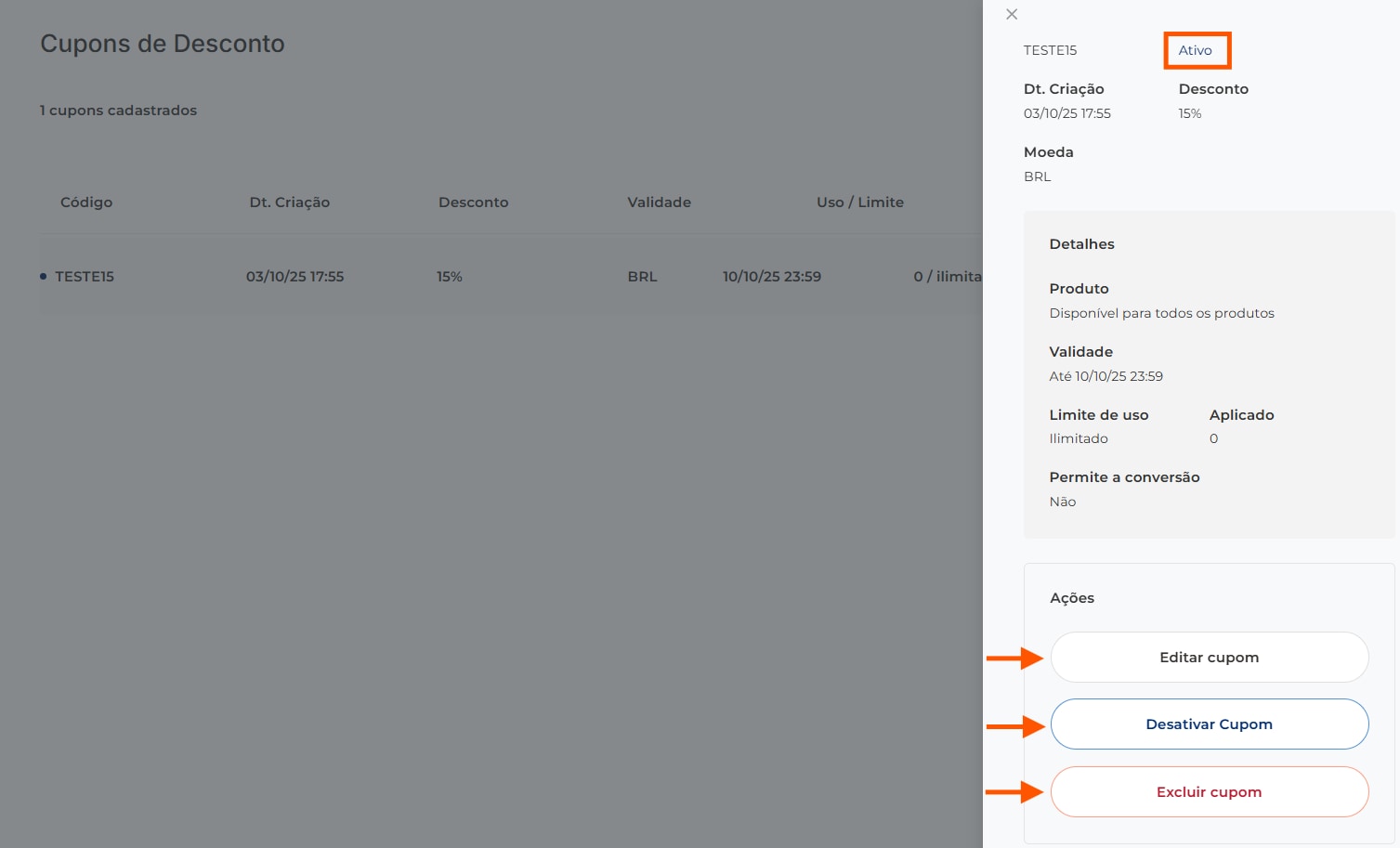 Ao abrir as informações do cupom, é possível ver seu status de funcionamento (ativo/desativo), além de três botões de ação como “Editar cupom”, “Desativar cupom” e “Excluir cupom”: