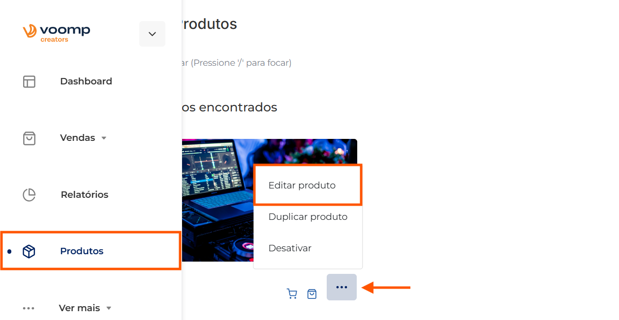 No menu lateral, clique na aba “Produtos” e acesse a edição do produto: