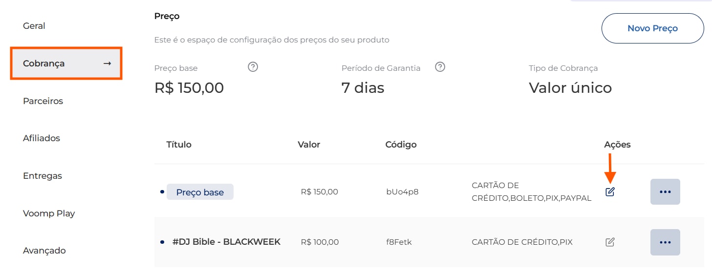 Na aba “Cobrança”, clique no botão de edição da oferta que deseja habilitar o cupom: