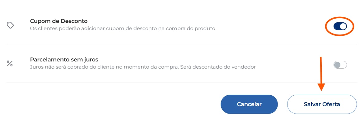 Habilite a opção “Cupom de Desconto” e clique em “Salvar Oferta”: