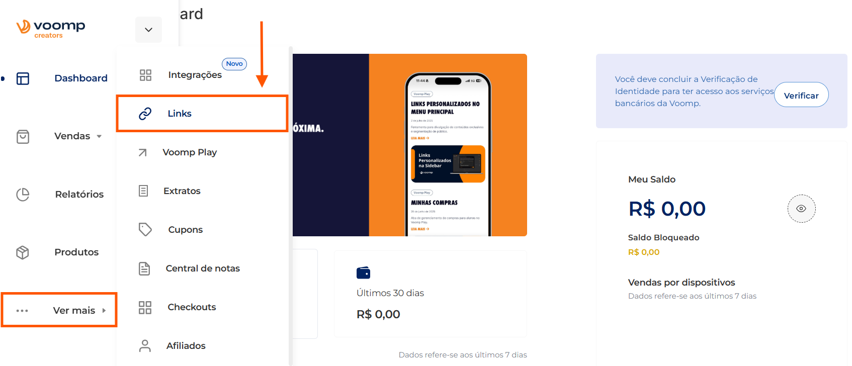 Para criar um link com o cupom de desconto já aplicado no checkout, acesse “Ver mais” > “Links” no menu lateral: