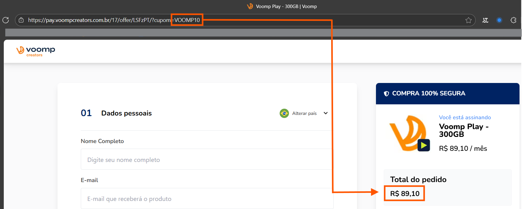 Assim que o link for acessado, o cupom de desconto estará localizado no final da URL, já computando a aplicação do desconto no valor final do conteúdo:
